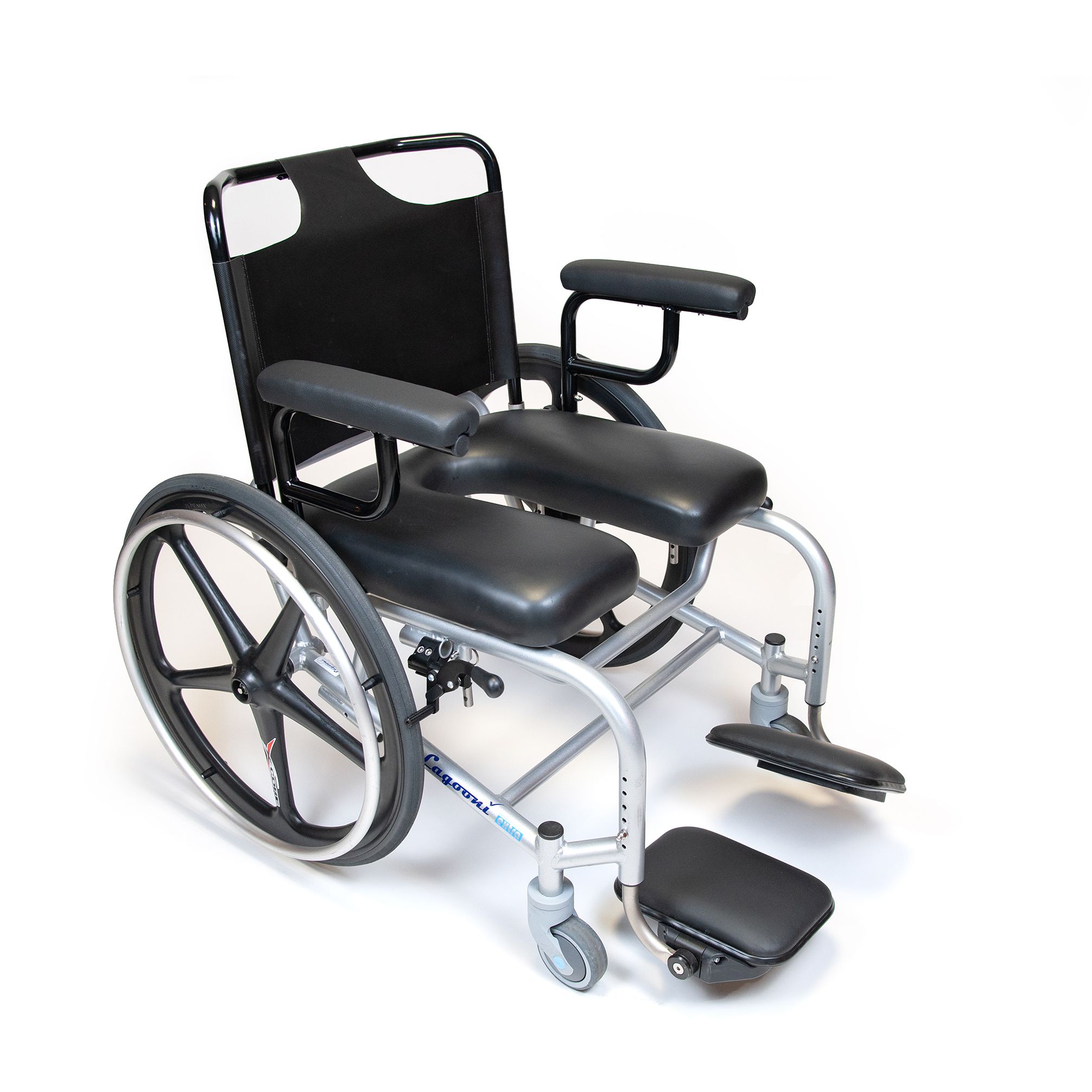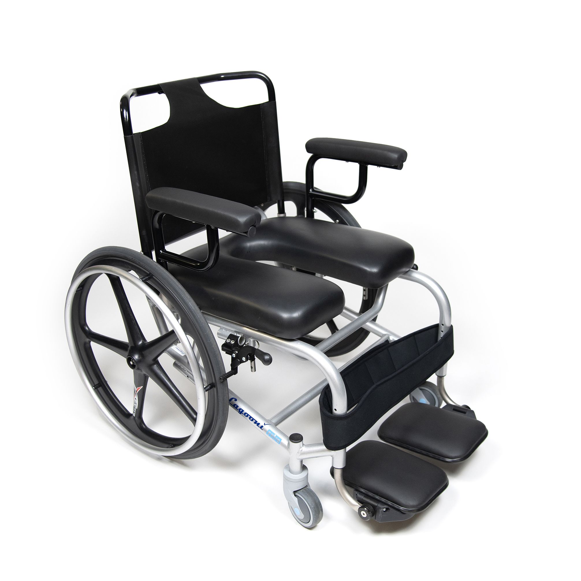 Self-propelled, extra-wide shower-toiletwheelchair with adjustment options and fixed footrest