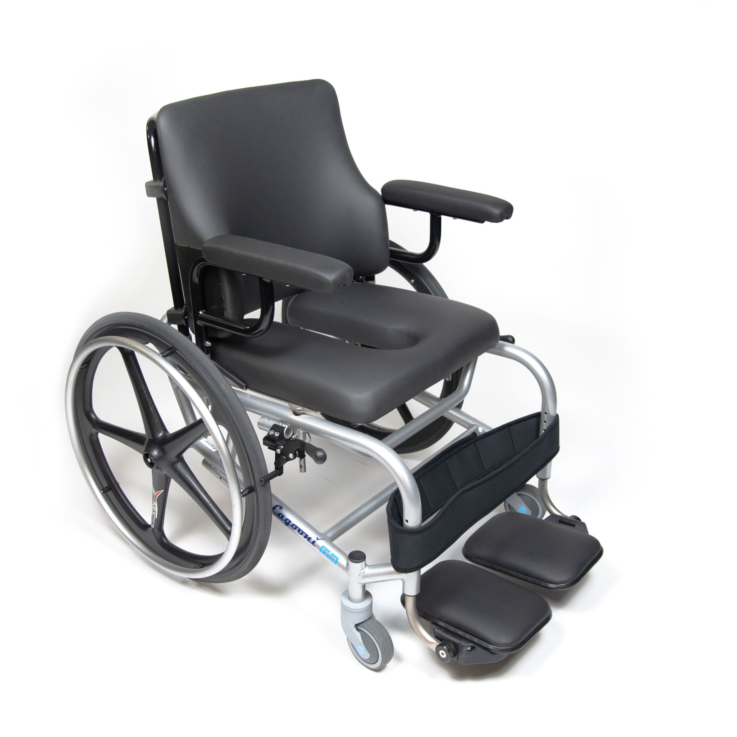 The self-propelled Lagooni Extra is a wide, but still very manoeuvrable shower wheelchair. Although the Lagooni extra is a bit wider, it still has a small turning circle with a fixed one or two-piece footrest. The frame is made of aluminium in combination with stainless steel. By using these materials, the shower commode chair is aside from being lightweight also waterproof. Disassemble the wheelchair quickly, without the use of any tool, and transport it with ease. This way, you can enjoy maximum (mobility) freedom with minimal effort!