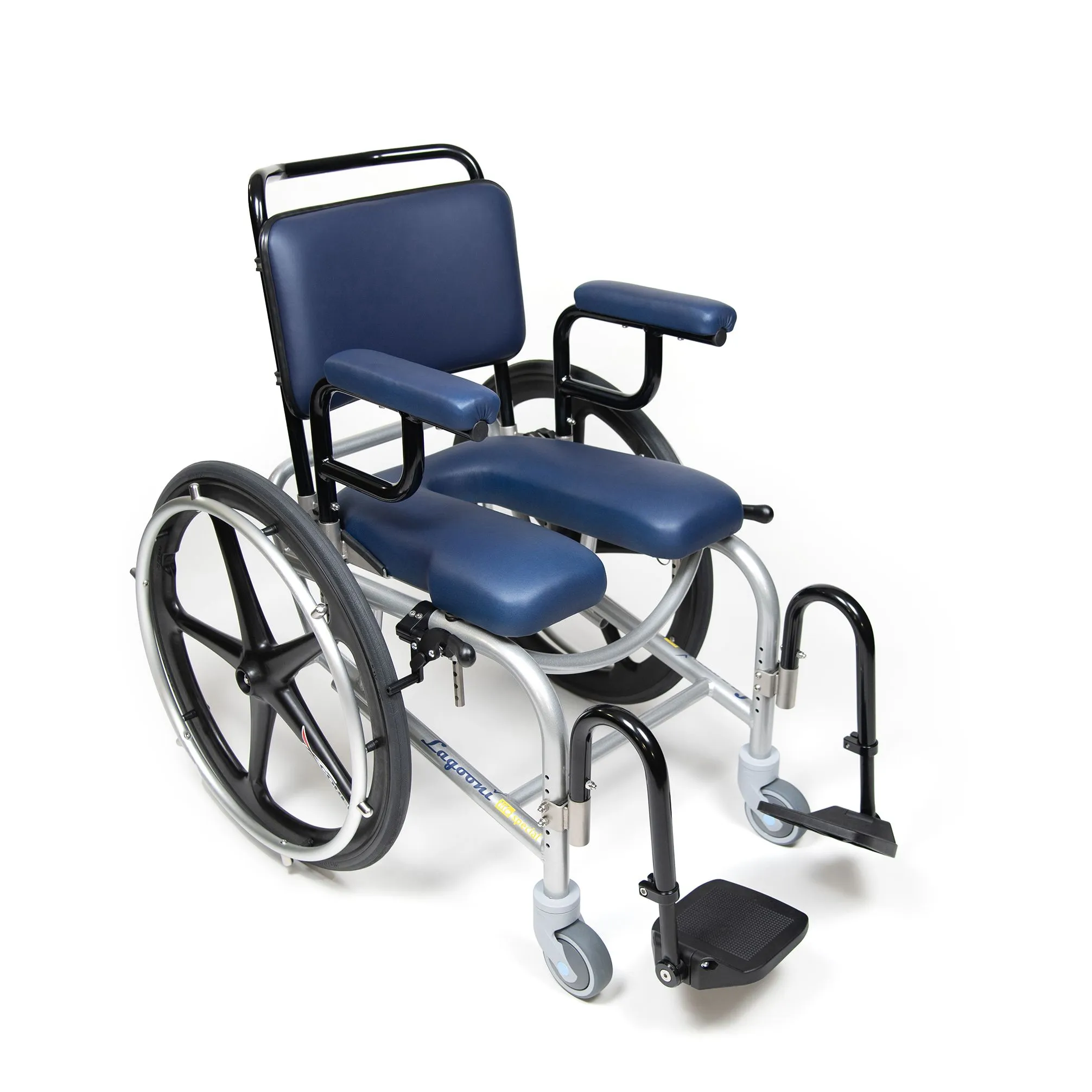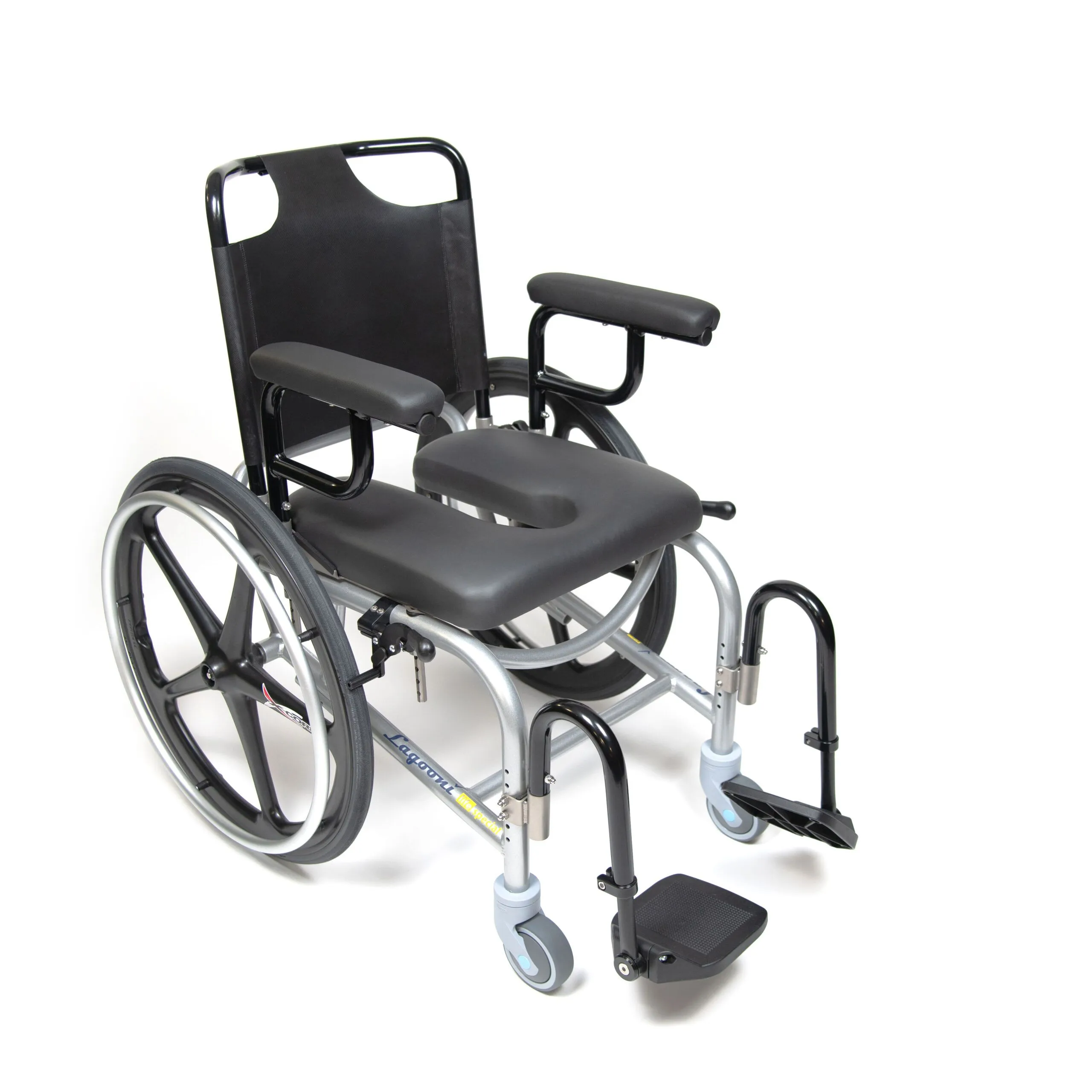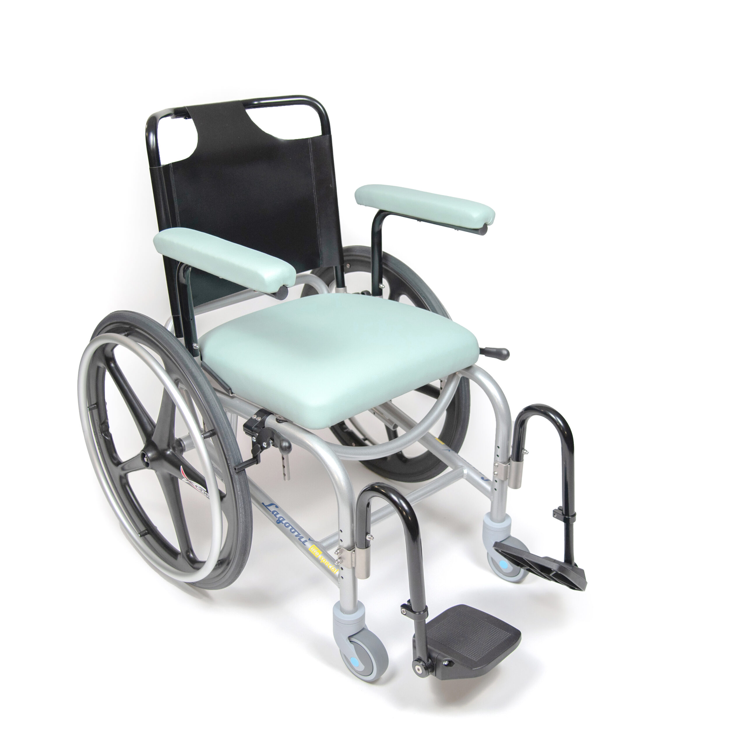 The Lagooni Life Special is a manoeuvrable self-propelled shower wheelchair. This compact model has a small turning circle with additional foot support for a shorter leg length. Make standing or tripping transfers easier by turning the leg rests away or removing them from the frame. The Lagooni Life Special is adjustable in seat height and has additional backrest options. The frame is made of aluminium in combination with stainless steel. By using these materials, the shower commode chair is aside from being lightweight also waterproof. Disassemble the wheelchair quickly, without the use of any tool, and transport it with ease. This way, you can enjoy maximum (mobility) freedom with minimal effort!