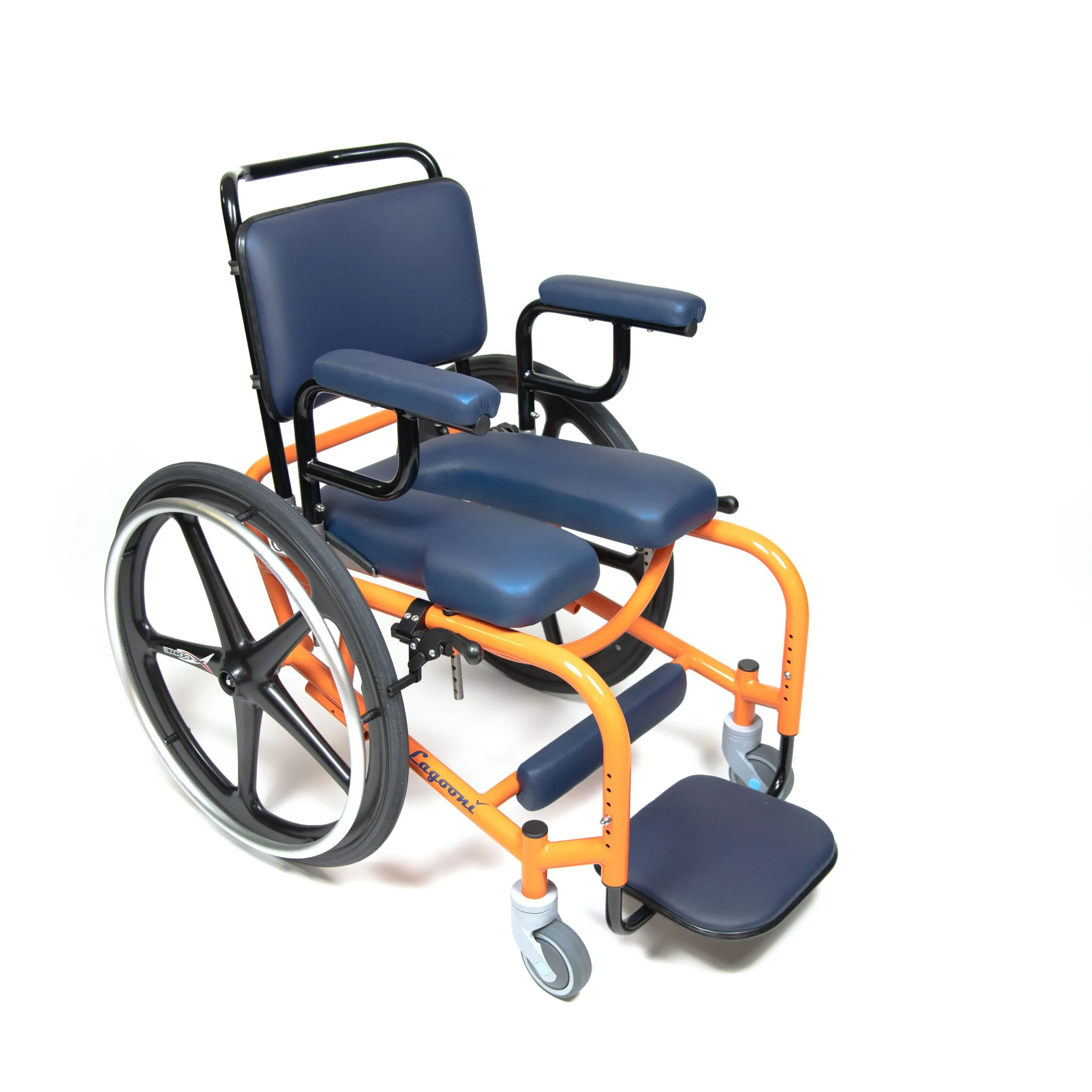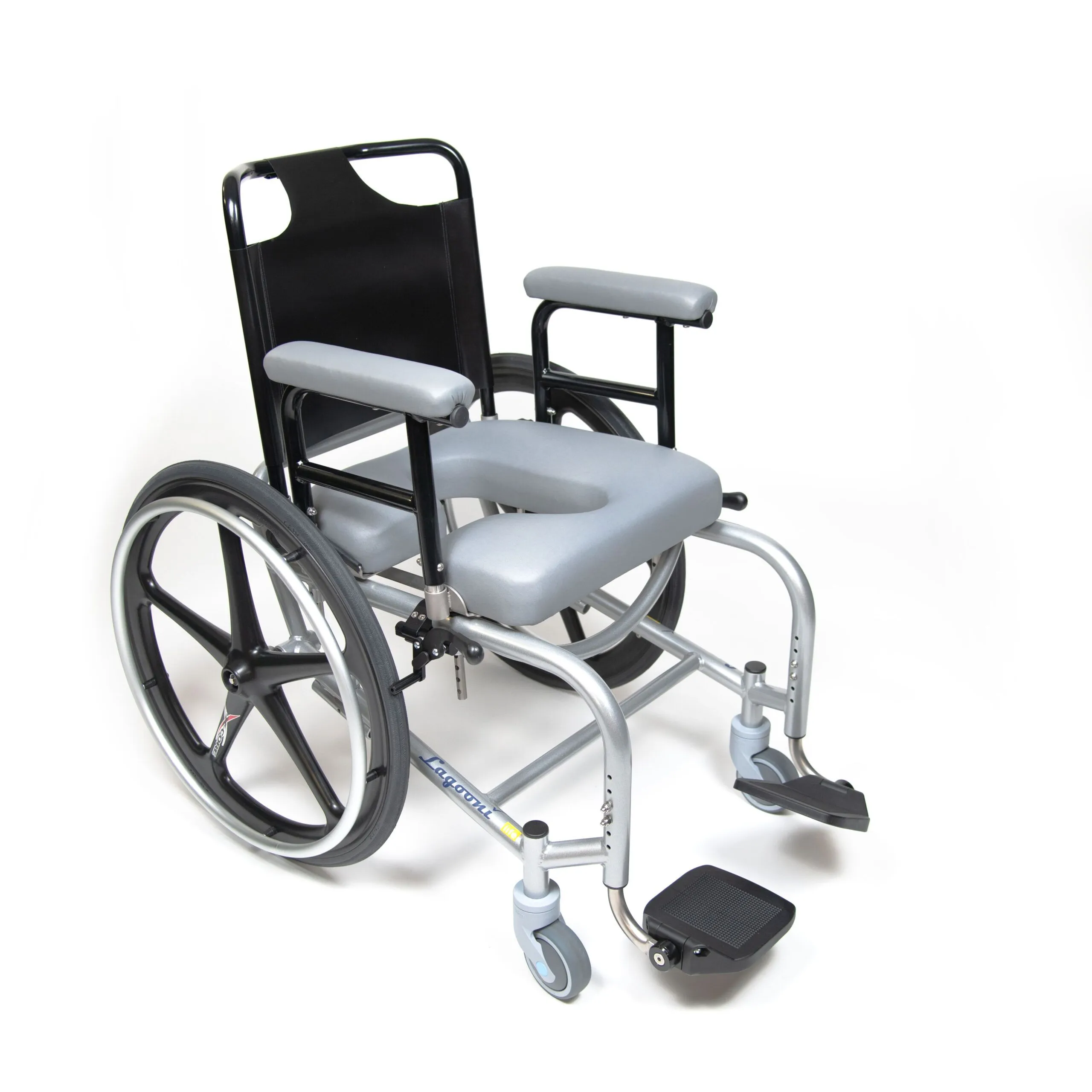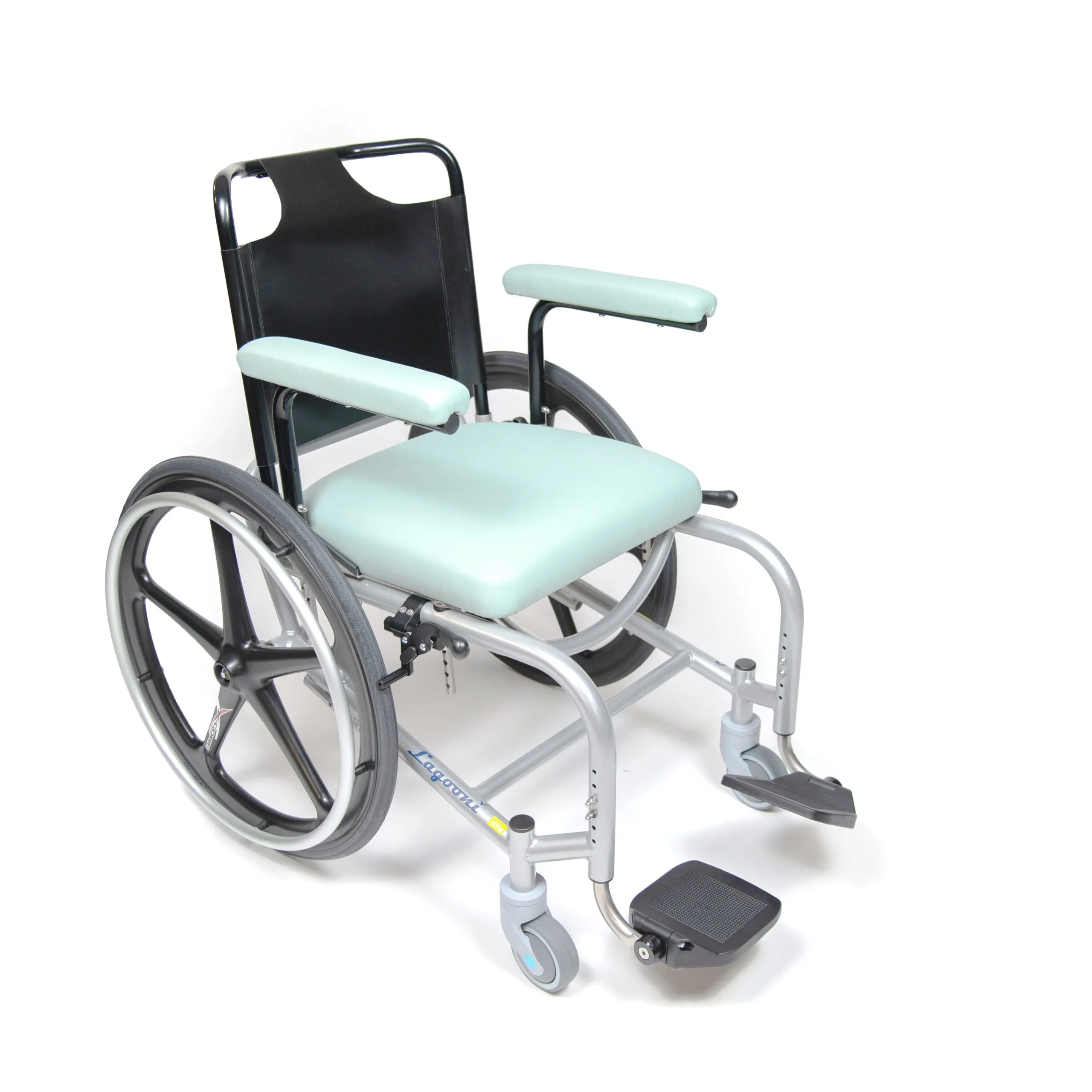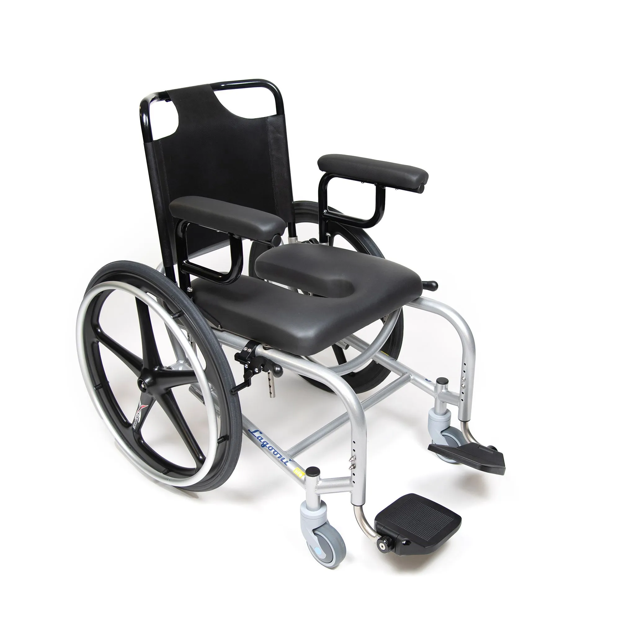The Lagooni Life is a manoeuvrable self-propelled shower wheelchair. This compact model has a small turning circle with the fixed, one or two-piece footrest. The Lagooni Life is adjustable in seat height and has additional backrest options.