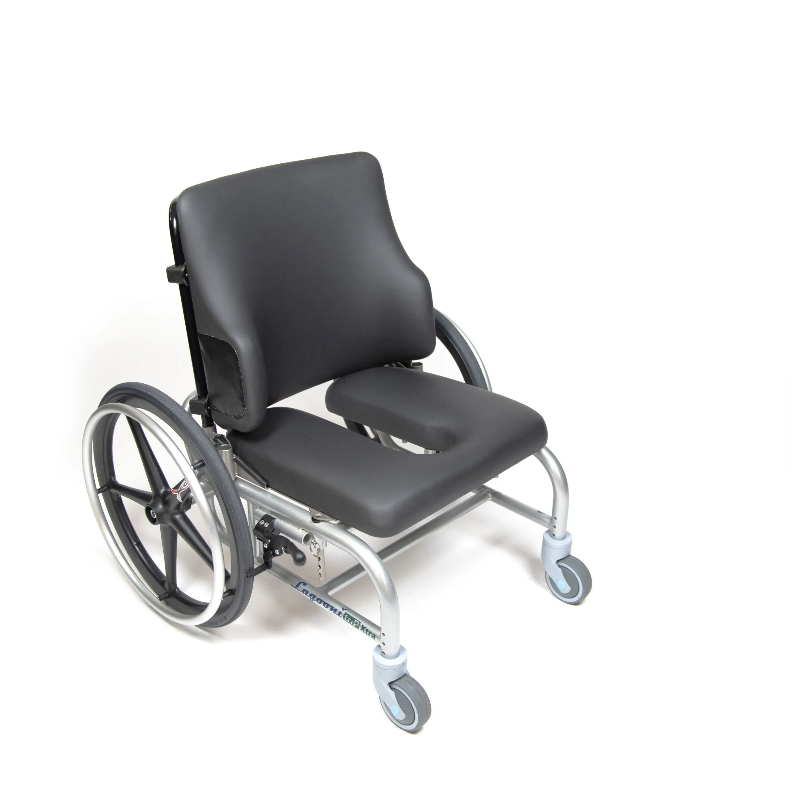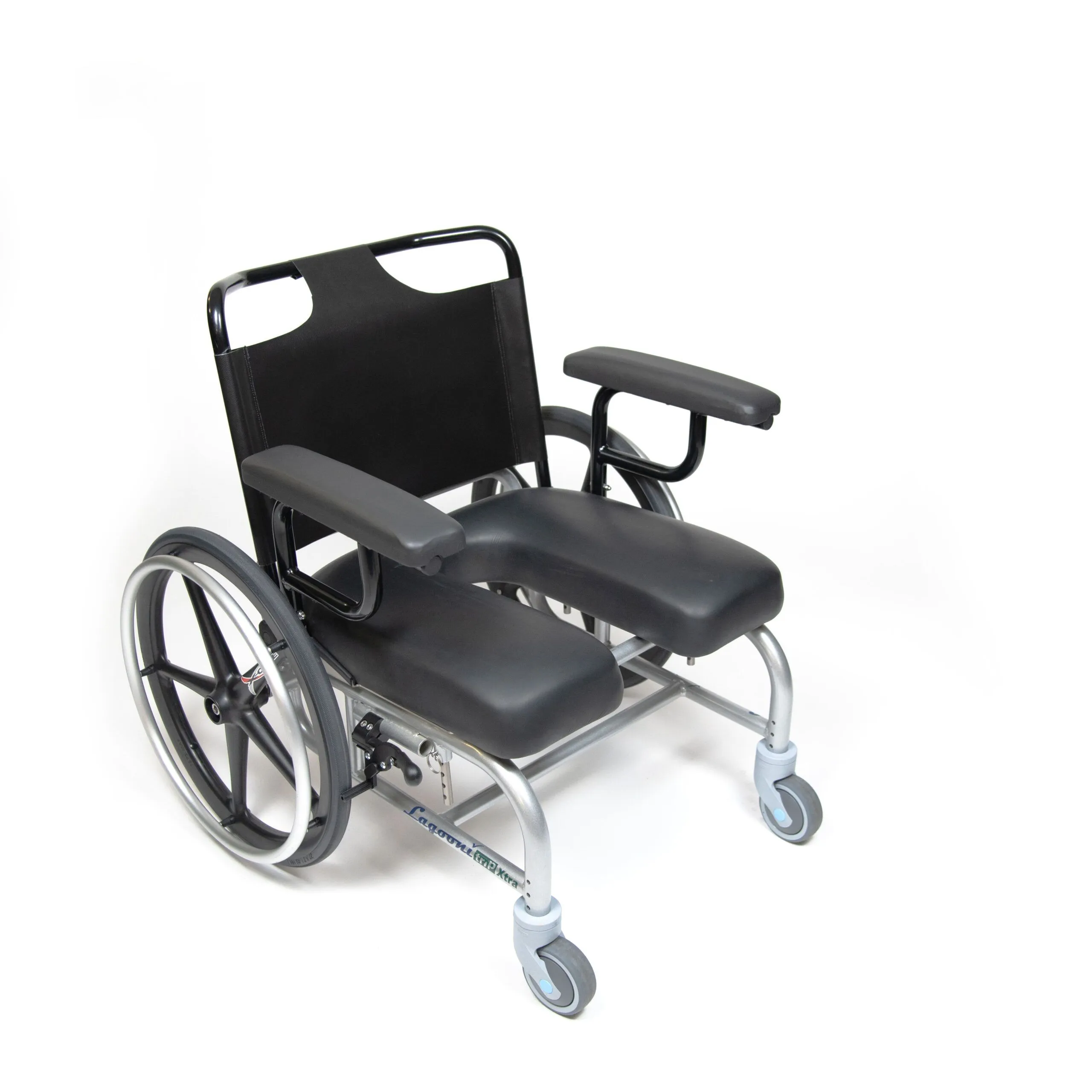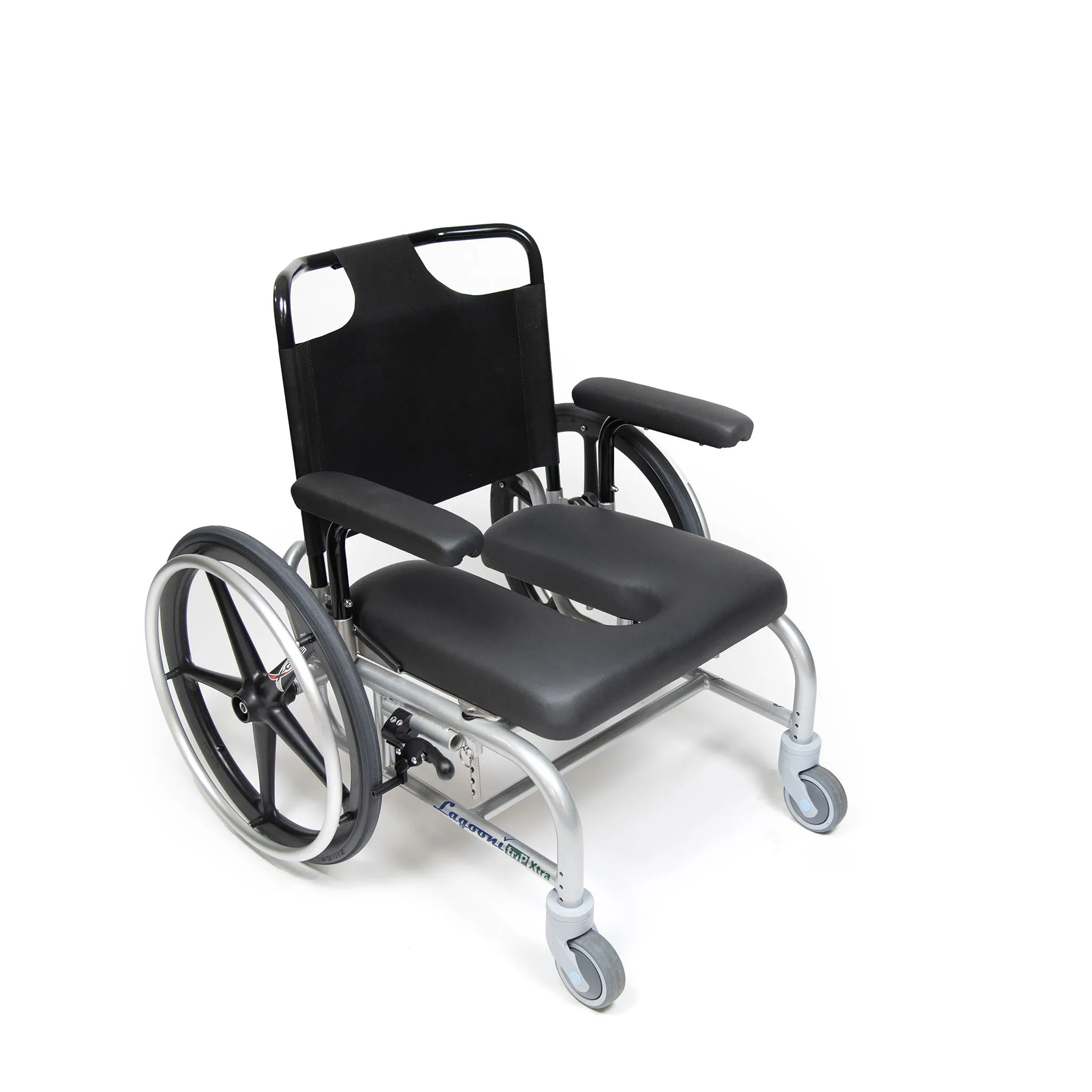 The Lagooni Trip Extra is a manoeuvrable self-propelled shower wheelchair. This compact model has a small turning circle with additional foot support for a shorter leg length. Make standing or tripping transfers easier by turning the leg rests away or removing them from the frame. The Lagooni Trip Extra is adjustable in seat height and has additional backrest options. The frame is made of aluminium in combination with stainless steel. By using these materials, the shower commode chair is aside from being lightweight also waterproof. Disassemble the wheelchair quickly, without the use of any tool, and transport it with ease. This way, you can enjoy maximum (mobility) freedom with minimal effort!